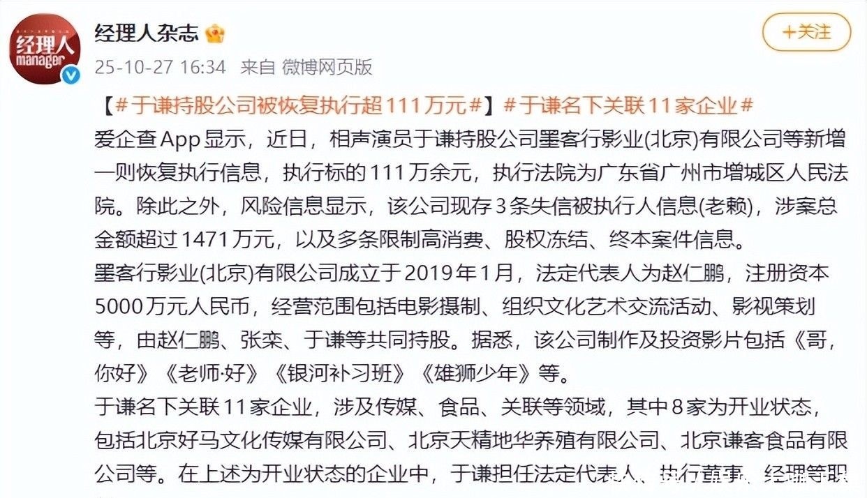 事实上,这笔债务并非源于于谦个人借贷违约,而是牵涉一家名为“墨客行影业有限公司”的企业债务危机。